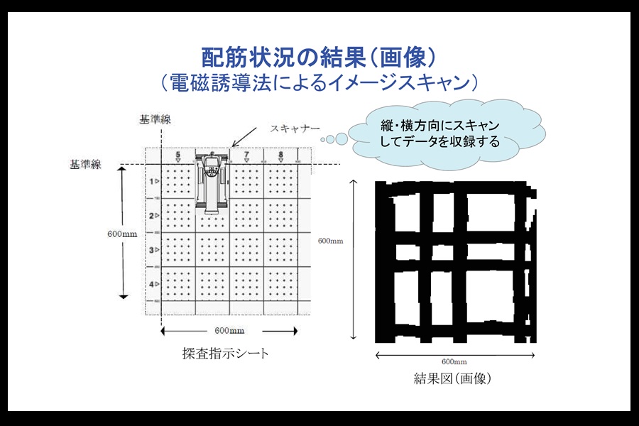 | 電磁波レーダ探査器を用いてコンクリート内部の鉄筋を探査します。鉄筋位置、かぶり厚さの測定が可能です。
